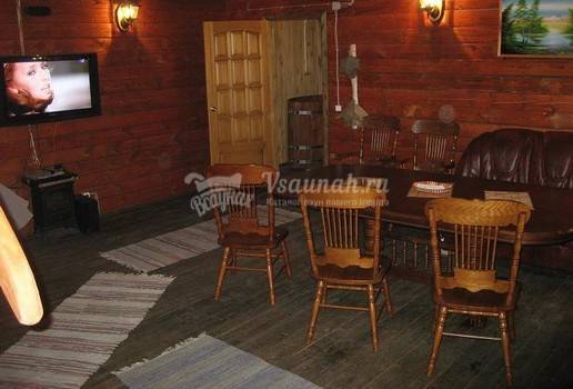 Баня выполнена в классическом деревянном стиле. Есть купель из лиственницы и веники для парной. После парилки вы всегда сможете сыграть на бильярде, спеть несколько песен в караоке или просто полежать в комфортных комнатах для отдыха.