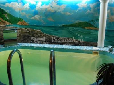 В большом зале на 6 человек — сауна с вениками и хамам, обливное ведро, бассейн с водопадом, ТВ, караоке, зона отдыха, 2 комнаты отдыха, зал с русским бильярдом.