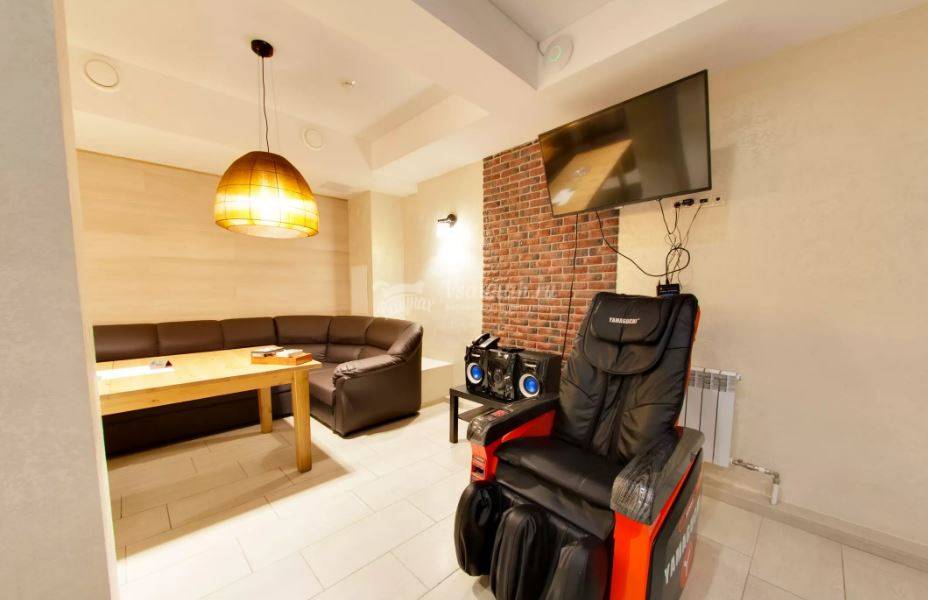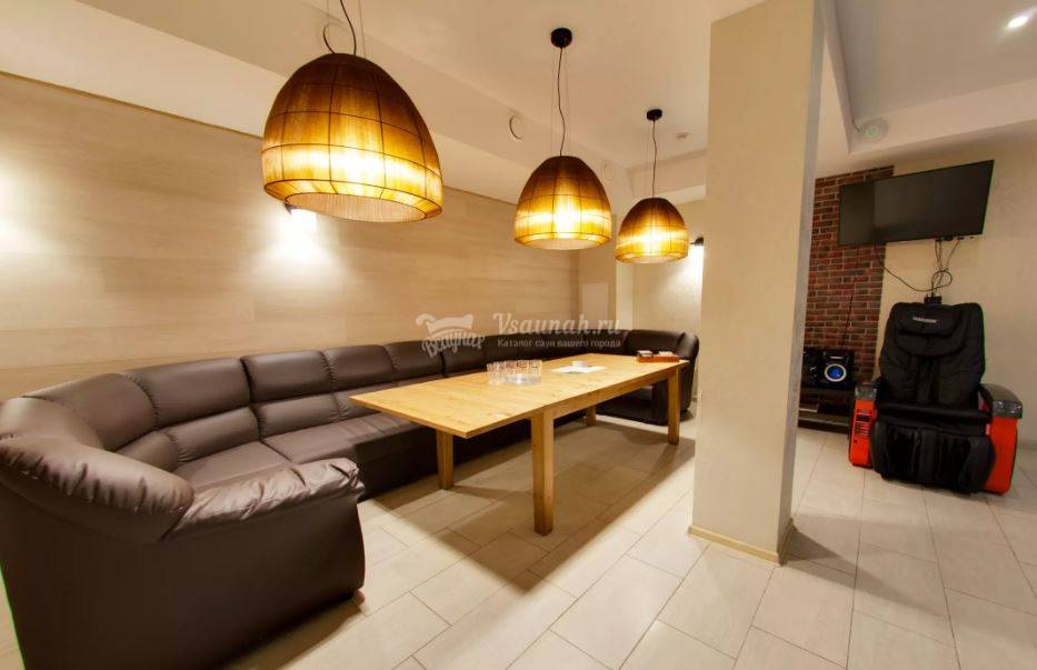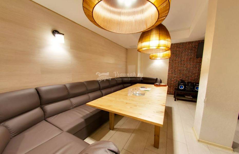 Не хочется в бассейн? Не беда! Вместо этого можно передохнуть в нашей комнате отдыха. Мы ставили своей целью создать здесь уютный, практичный интерьер из преимущественно натуральных, безопасных материалов, подобрать мебель, которая будет в равной степени удобной и приятной глазу. Надеемся, что вам понравится! Для поддержания атмосферы отдыха мы можем предложить вам бильярд, кальян и караоке. Также у нас имеется бар, где вы можете приобрести блюда русской кухни, а при необходимости прийти и с собственной едой — мы не возражаем! Главное помните, что плотная трапеза незадолго перед посещением парной - это не самая удачная идея, по мнению терапевтов. А вот после парной — совсем другое дело!